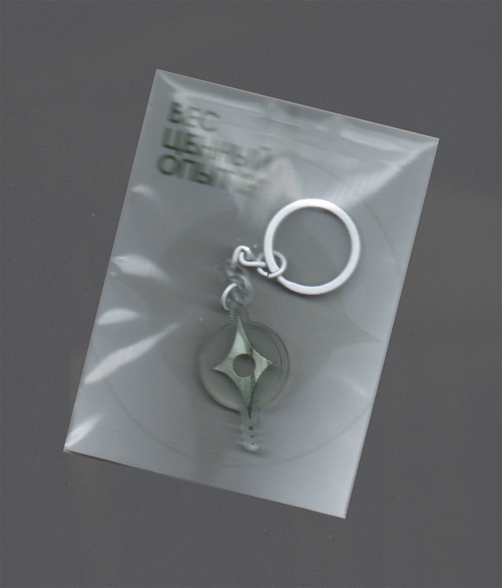 Брелок с символом Шей и белым металлическим колечком.