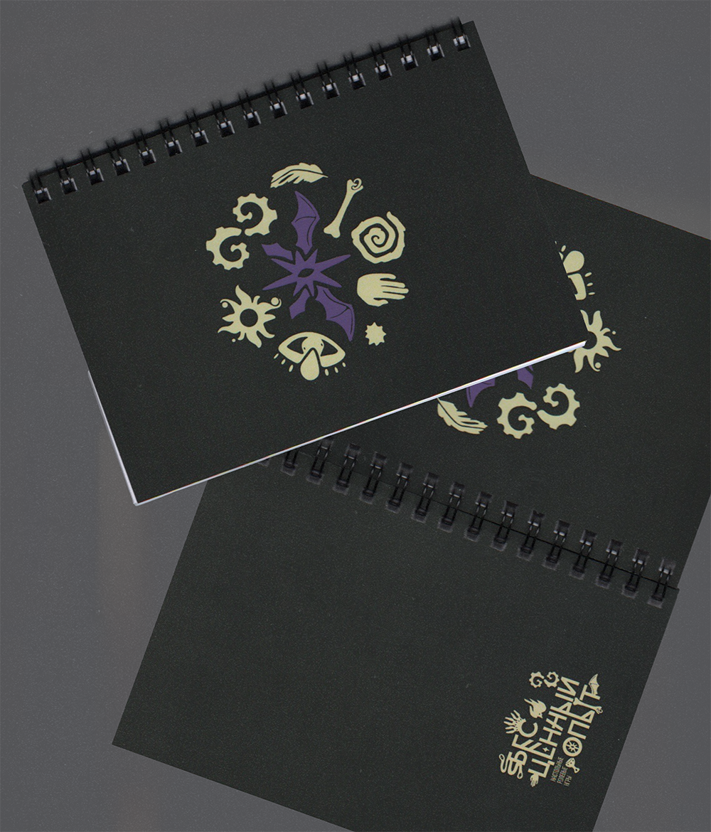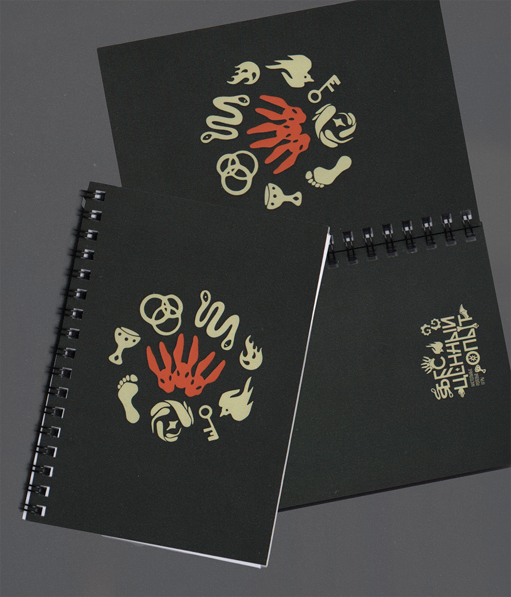 Блокнот с принтом «Некротики» на чёрном фоне.