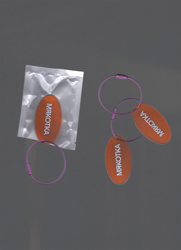 Брелок с надписью «МЯКОТКА» на стальном тросике.