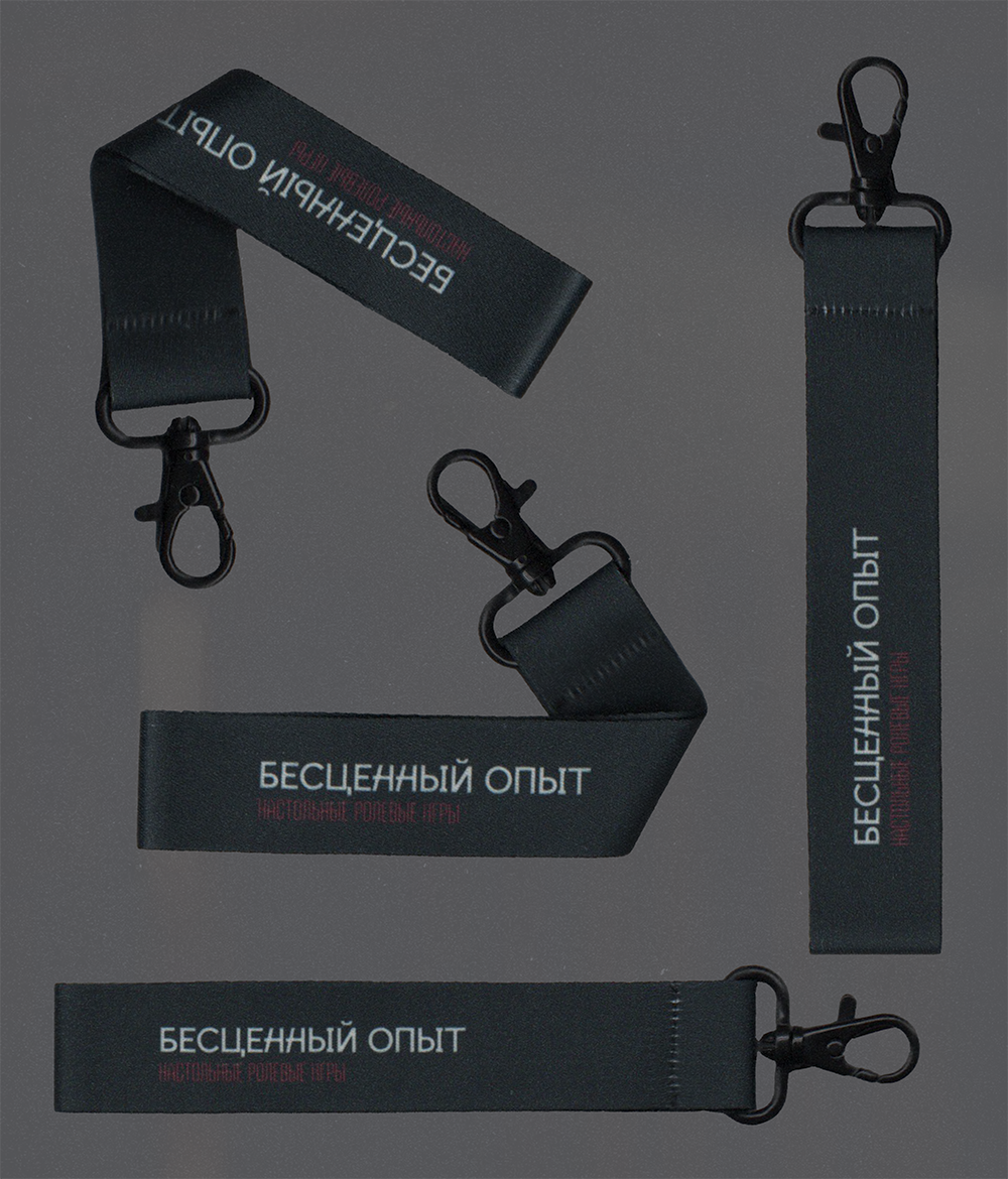 Ремувка (брелок-лента) с принтом «Бесценный опыт» на чёрном фоне.